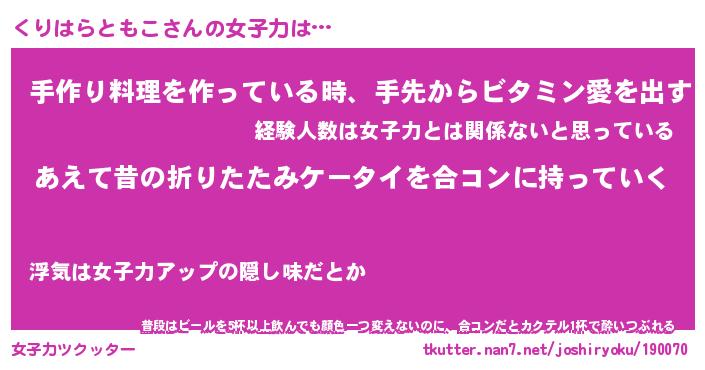| 胡散臭い通販商品みたいなあだ名 | 『必ず成功する霊験あらたかなお札…その名も「くりはらともこ」』 |