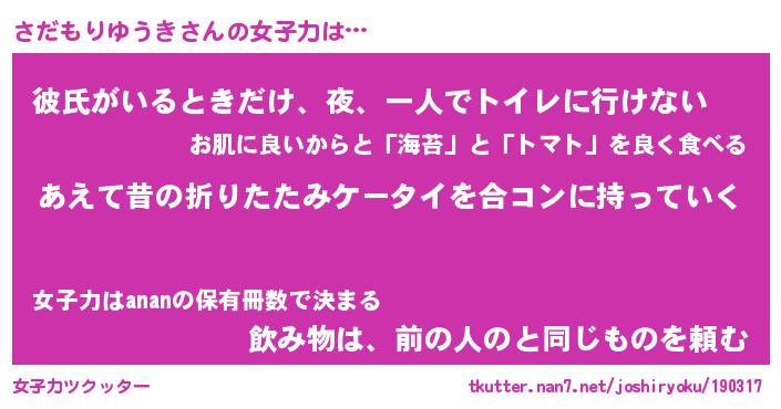 | 肩書あだ名 | 『さだもりゆうき御曹司』 |