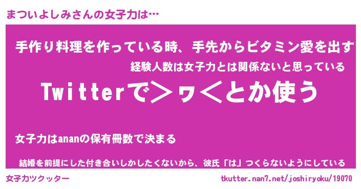| ヘコむあだ名 | 『まつっふぃ~』『つくし』 |