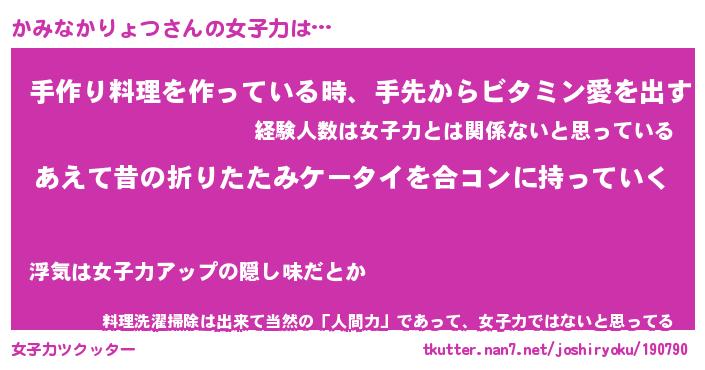 | 恥ずかしいあだ名 | 『プリティーかみなかりょつ』『かみちん』 |