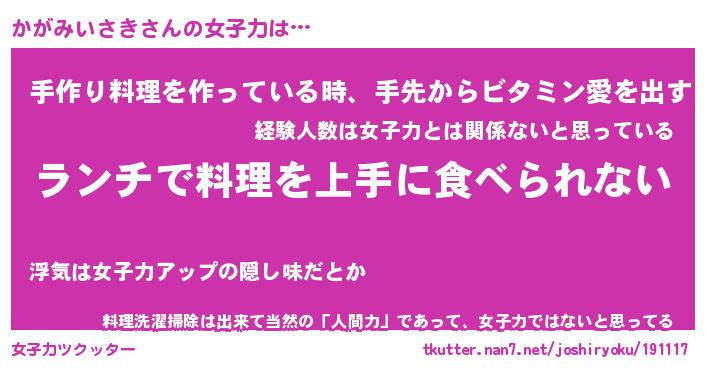 | 恥ずかしいあだ名 | 『プリティーかがみいさき』『かがっちょ』 |