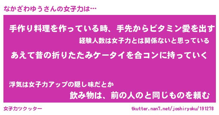 | 恥ずかしいあだ名 | 『プリティーなかざわゆう』『なかっちょ』 |