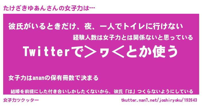 | 恥ずかしいあだ名 | 『プリティーたけざきゆあん』『たけちん』 |