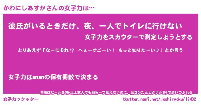 | 肩書あだ名 | 『かわにしあすか御曹司』 |