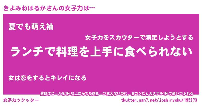 | 恥ずかしいあだ名 | 『プリティーきよみねはるか』『きよちん』 |
