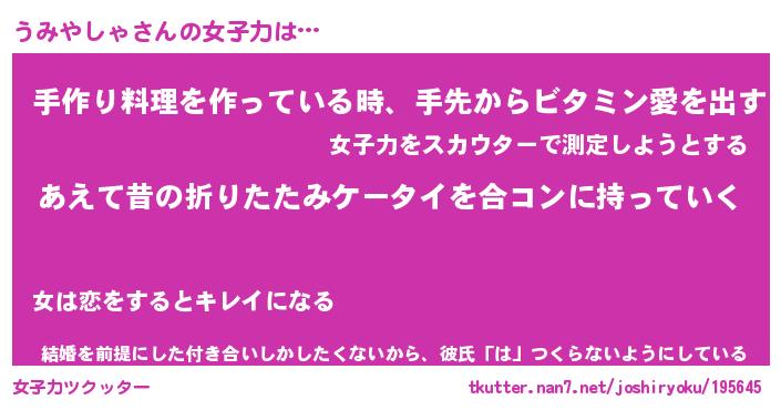 | ファンタジー風あだ名 | 『ウミフェル』『エターナルウミヤシャー』 |