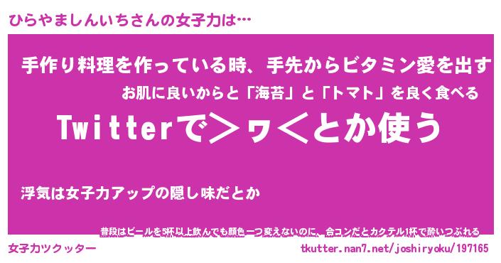 | ヘコむあだ名 | 『ひらにゅー』『酢こんぶ』 |