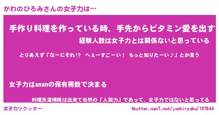 | 恥ずかしいあだ名 | 『プリティーかわのひろみ』『かわっちょ』 |