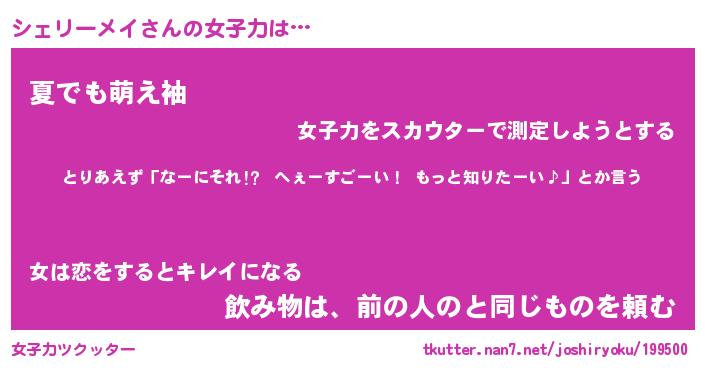 | 恥ずかしいあだ名 | 『プリティーシェリーメイ』『シェっちょ』 |