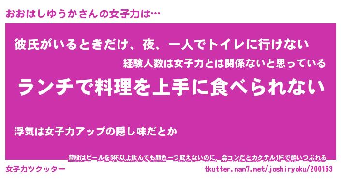| 恥ずかしいあだ名 | 『プリティーおおはしゆうか』『おおちん』 |