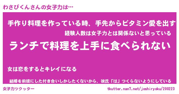 | ファンタジー風あだ名 | 『ワサフェル』『エターナルワサビクンー』 |