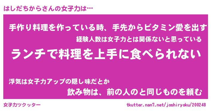 | ヘコむあだ名 | 『はしにゅー』『レバニラ』『はしお』 |