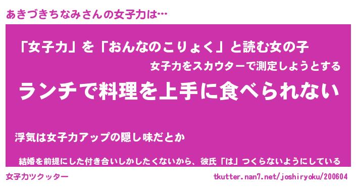 | 胡散臭い通販商品みたいなあだ名 | 『億万長者になれるブレスレット…その名も「あきづきちなみ」』 |