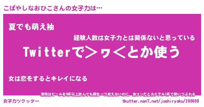 | ヘコむあだ名 | 『こばふぇ~』『酢こんぶ』『こばを』 |