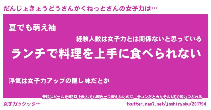 | 料理風あだ名 | 『ネギたっぷりだんじょきょうどうさんかくねっとの南蛮漬け』 |