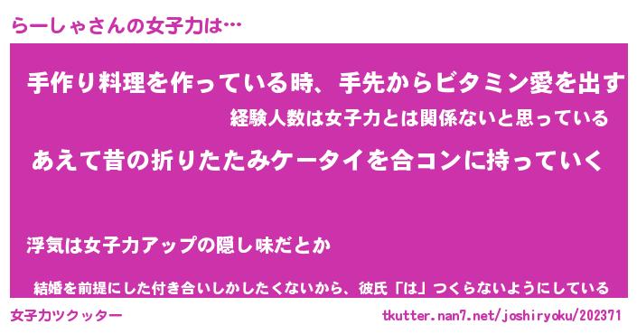 | 意味不明あだ名 | 『ペロリンらーしゃ』『永久保存らーしゃ』 |