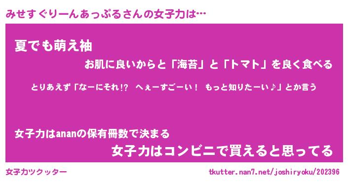 | 肩書あだ名 | 『みせすぐりーんあっぷるCEO』 |