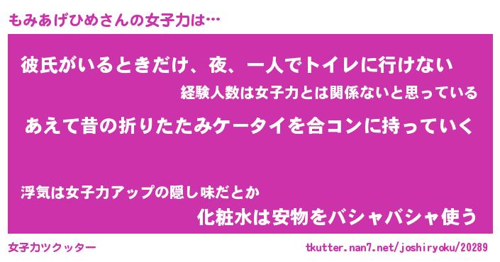 | ヒーロー風カッコイイあだ名 | 『スーパーモミアゲヒメ』『魔戒騎士モミ』 |