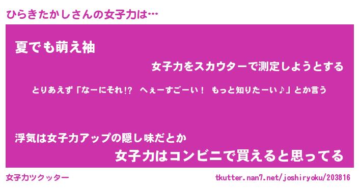 | ヒーロー風カッコイイあだ名 | 『スーパーヒラキタカシ』『天弓騎士ヒラ』 |