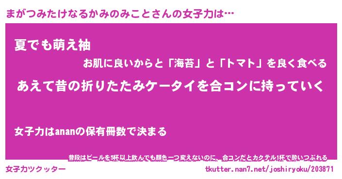 | 恥ずかしいあだ名 | 『プリティーまがつみたけなるかみのみこと』 |