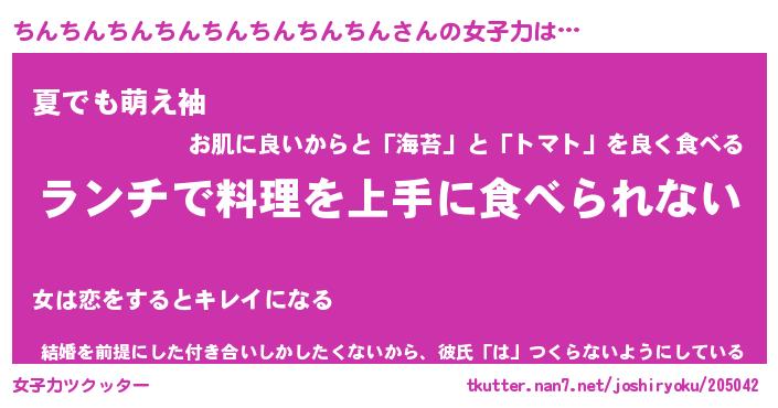 | 料理風あだ名 | 『ネギたっぷりちんちんちんちんちんちんちんちんの南蛮漬け』 |