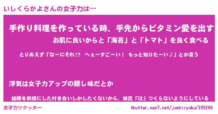 | 恥ずかしいあだ名 | 『プリティーいしくらかよ』『いしっちょ』 |