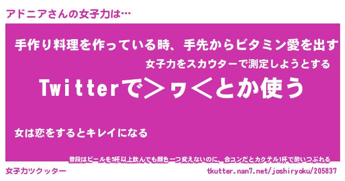 | 意味不明あだ名 | 『ペロリンアドニア』『永久保存アドニア』 |