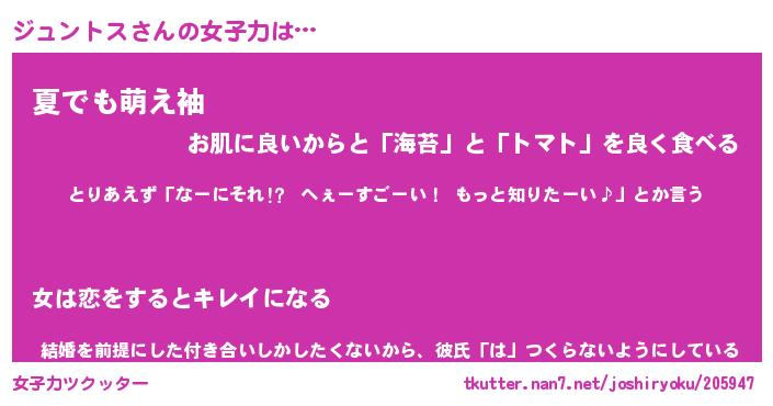 | ヘコむあだ名 | 『ジュもー』『なまこ酢』『ジュっぺ』 |