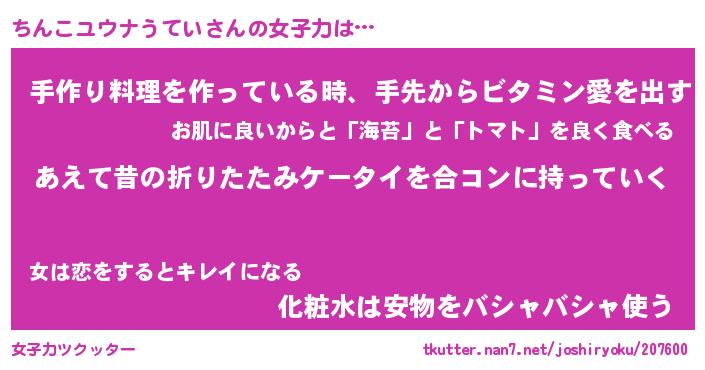 | 料理風あだ名 | 『ほっこり♪ちんこユウナうていの味噌そぼろ煮』 |