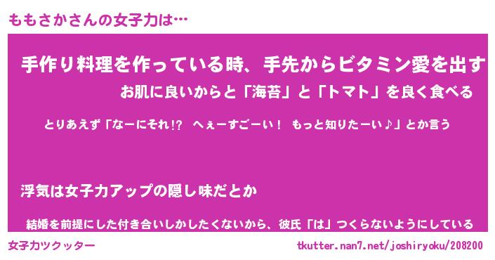 | ヘコむあだ名 | 『ももふぇ~』『つくし』『ももっぺ』 |