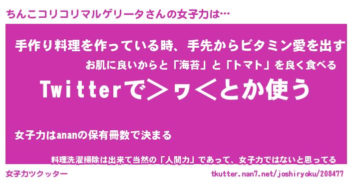 | 料理風あだ名 | 『節約★ちんこコリコリマルゲリータと油揚げの玉子丼』 |