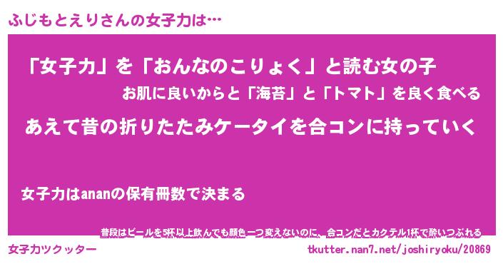 | 恥ずかしいあだ名 | 『プリティーふじもとえり』『ふじっちょ』 |