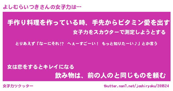 | 恥ずかしいあだ名 | 『プリティーよしむらいつき』『よしちん』 |
