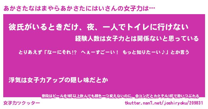 | ヘコむあだ名 | 『あかにー』『つくし』『あか太郎』 |