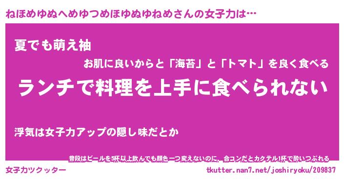 | 料理風あだ名 | 『ネギたっぷりねほめゆぬへめゆつめほゆぬゆねめの南蛮漬け』 |