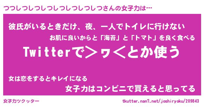 | 女子向けラノベタイトル風あだ名 | 『つつしつしつしつしつしつしつしつ姫と円卓の騎士』 |