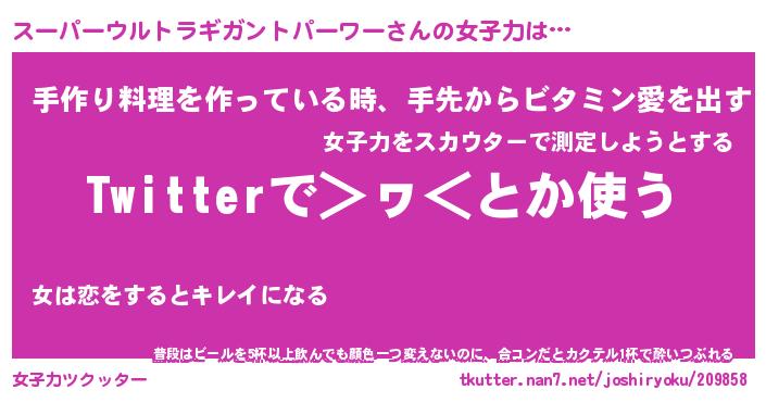 | 男性向けラノベタイトル風あだ名 | 『スーパーウルトラギガントパーワーの憂鬱』 |