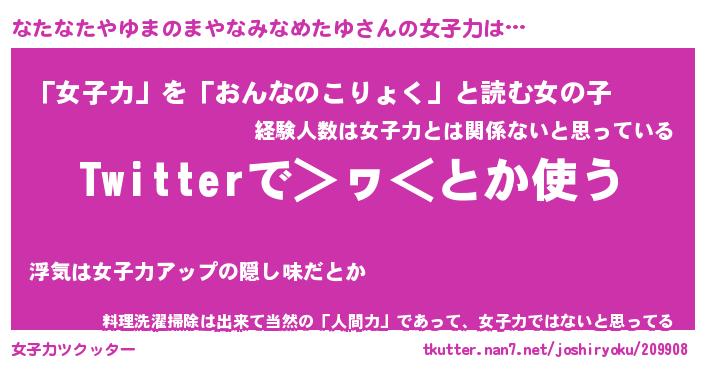 | ツイッター | なたなたやゆまのまやなみなめたゆさんのツイッターID『kikurage_star』 |
