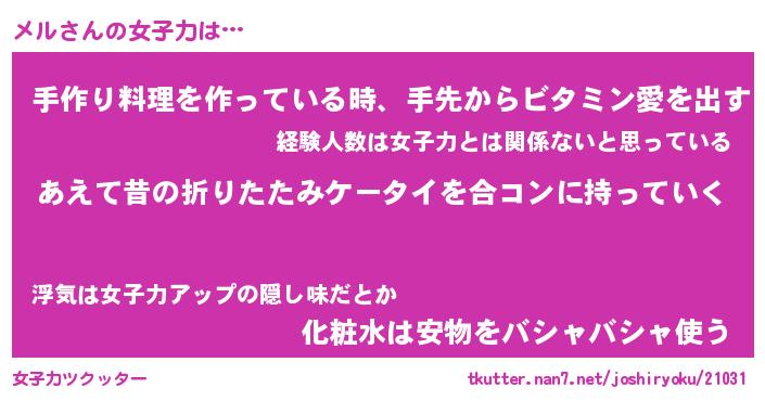 | ヘコむあだ名 | 『メルっふぃ~』『つくし』『メルを』 |
