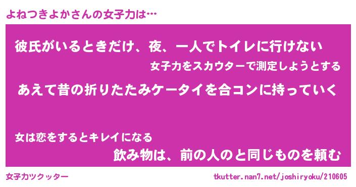 | 女子向けラノベタイトル風あだ名 | 『(仮)よねつきよかのやんごとなき事情』 |