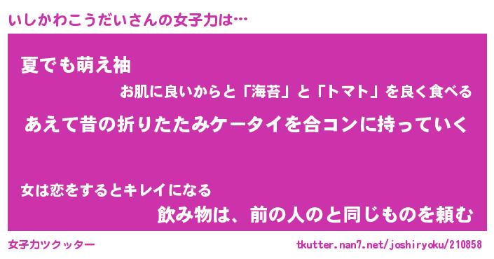 | 女子向けラノベタイトル風あだ名 | 『(仮)いしかわこうだいのやんごとなき事情』 |