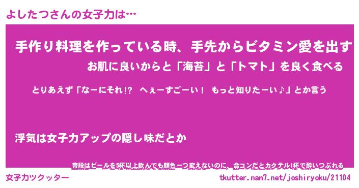 | ヘコむあだ名 | 『よしにー』『なまこ酢』『よし太郎』 |