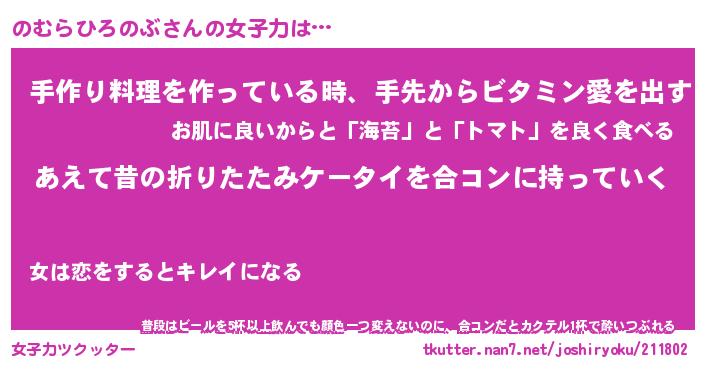 | 女子向けラノベタイトル風あだ名 | 『(仮)のむらひろのぶのやんごとなき事情』 |