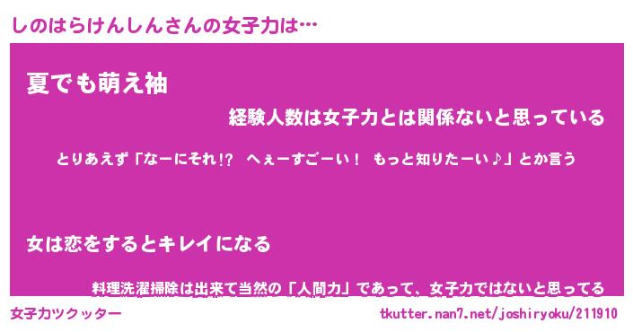 | ヘコむあだ名 | 『しのふぇ~』『なまこ酢』『しのを』 |