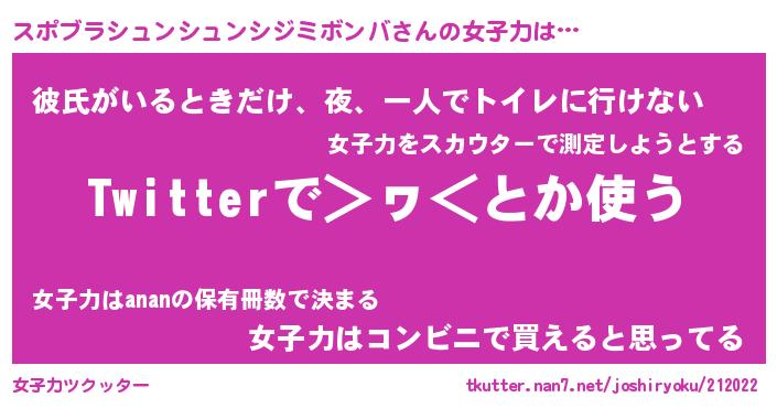 | 男性向けラノベタイトル風あだ名 | 『スポブラシュンシュンシジミボンバの憂鬱』 |