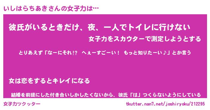 | 恥ずかしいあだ名 | 『プリティーいしはらちあき』『いしちん』 |