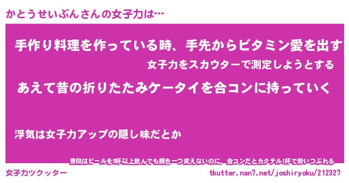 | ヘコむあだ名 | 『かともー』『つくし』『かとぷりん』 |