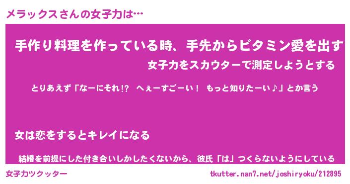 | 女子向けラノベタイトル風あだ名 | 『誰かこのメラックスを説明してください! ~契約から始まるウェディング~』 |
