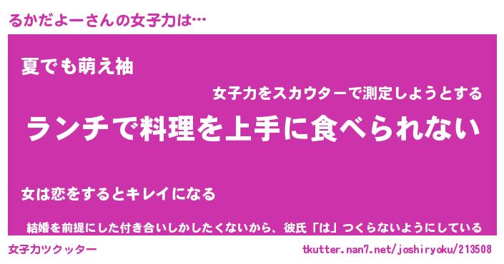 | ヘコむあだ名 | 『るかにゅー』『なまこ酢』『るかを』 |