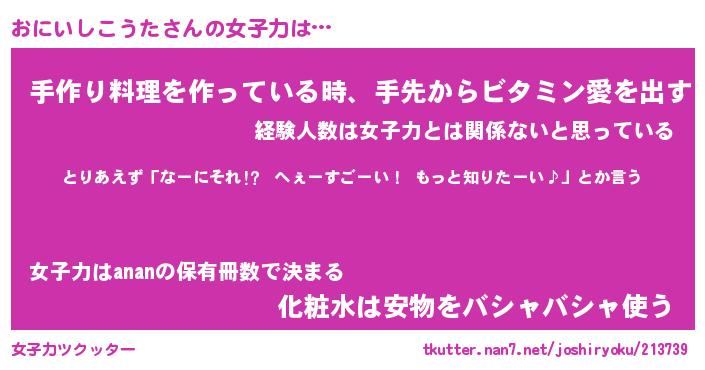 | 恥ずかしいあだ名 | 『プリティーおにいしこうた』『おにちん』 |
